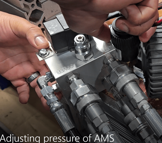 The switching pressure setting of the AMS manifold must be above the pressure needed to lift the boat, but less than the the max pressure of the pump, which is set by the pump’s pressure relief valve. Turn the knob counter clockwise to decrease the switching pressure if the cover is not activating in the up position. Turn the knob clockwise if the cover is activating before the lift is in the fully raised position. Watch this video for detail: